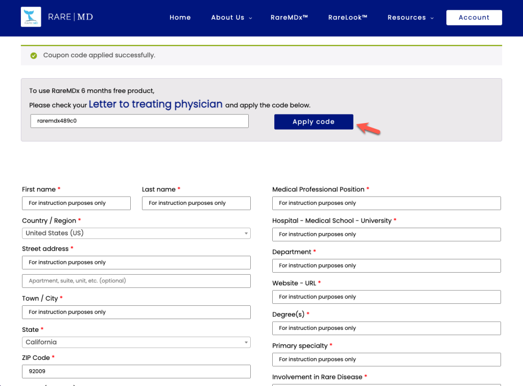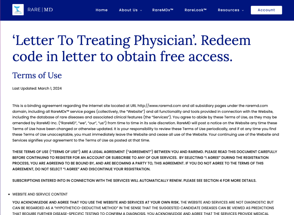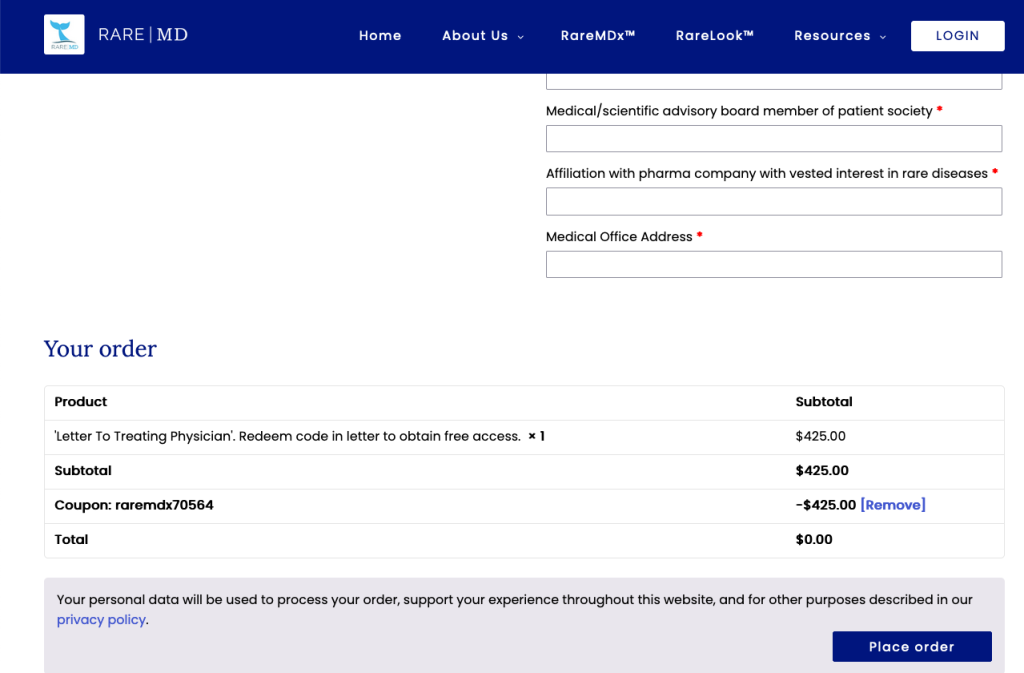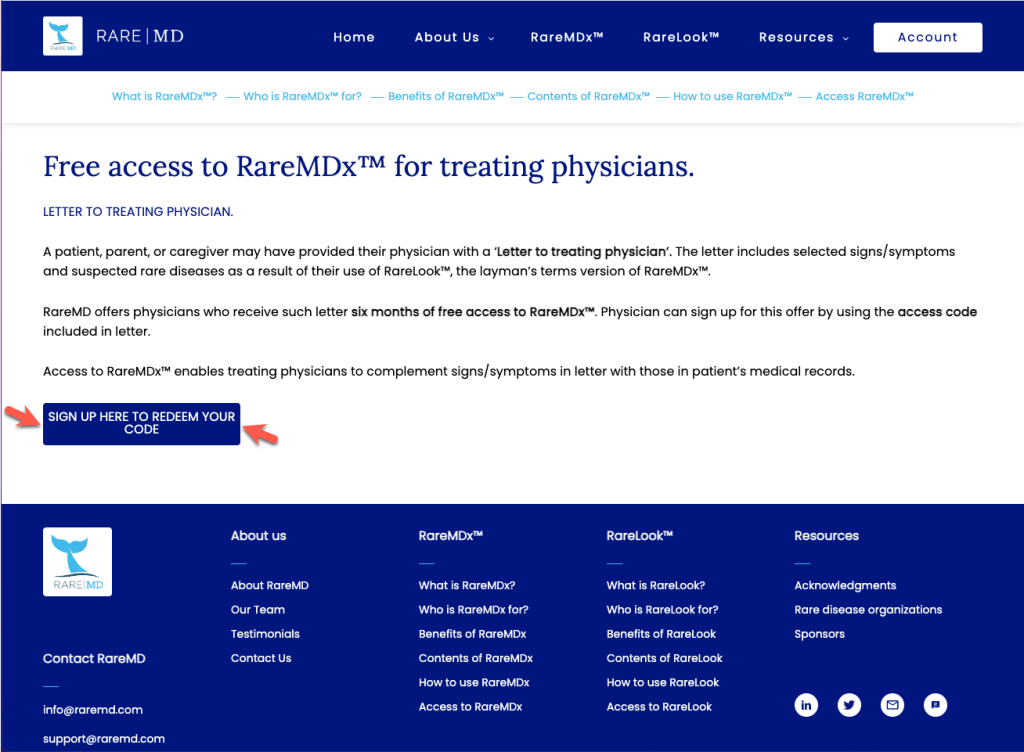 For medical professionals who received a so called ‘Letter To Treating Physician’ from his/her patient here is how to redeem that Code to obtain free access to RareMDx for a period of six (6) months?