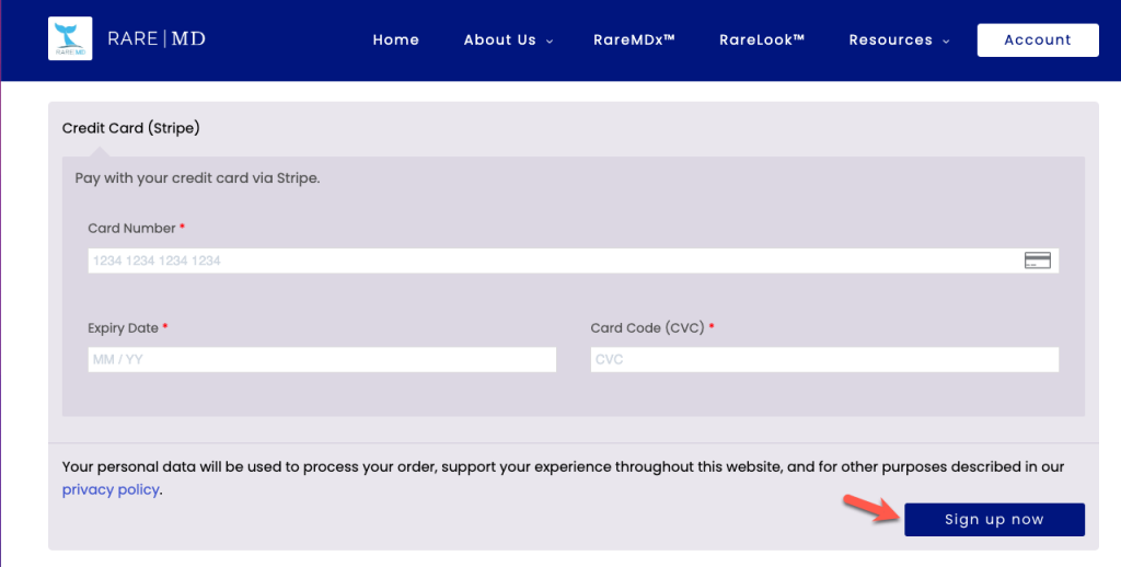 h) Provide credit card information. Please note that CC information will only be used for automatic renewal at the time of expiration i.e., 6 months from date you signed up for this free trial period. If you prefer not to use RareMDx beyond this free trial period, please cancel prior to expiration. When completed click ‘Sign up now’.